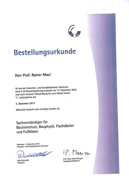 2005 öffentlich bestellter und vereidigter Sachverständiger ( ö.b.v.) der IHK Karlsruhe für die Bereiche Bautenschutz, Bauphysik, Flachdächer, Fussböden